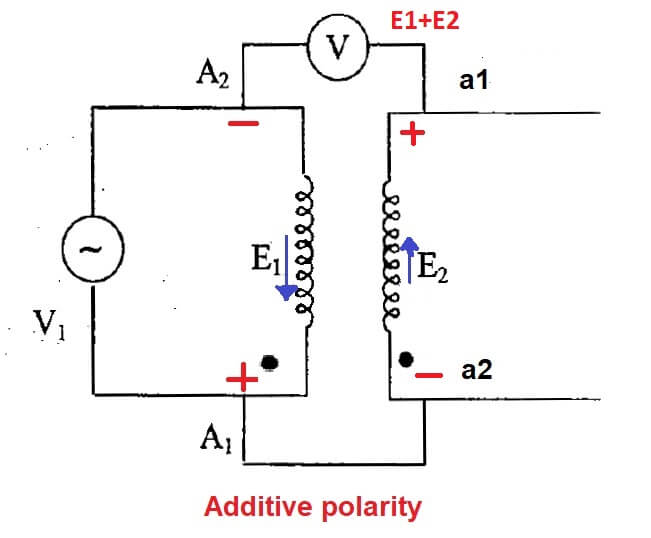 >En otras condiciones, si la lectura del voltímetro muestra el voltaje como E1+E2 (polaridad aditiva) entonces el terminal conectado a A1 es negativo y el terminal A2 es positivo y está etiquetado como a2 otro a1 como se muestra en la figura