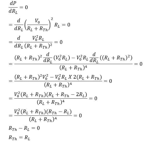 En el circuito equivalente de Thevenin anterior, el teorema de transferencia de potencia máxima establece que «la cantidad máxima de potencia se entregará en la resistencia de carga si la resistencia de carga es igual a la resistencia de la fuente de Thevenin o Norton.