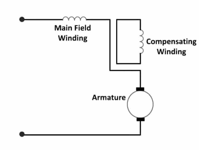 Si el devanado compensado está conectado en serie con la armadura y el devanado de campo, en tal caso, el motor se denomina motor conductivamente compensado. el diagrama de conexión se muestra a continuación.